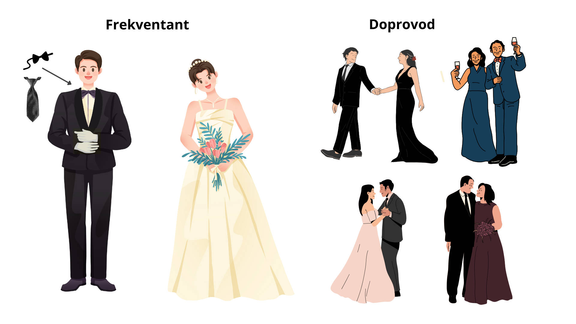 - Oblečení vhodné na plesy, prodloužené a další akce taneční školy: Vhodné oblečení na akce je dle obecných zvyklostí předepisováno na pozvánkách či vstupenkách. Platí pro všechny účastníky, tedy i pro hosty. Často je uvedeno „black tie“ (doslova v překladu „černá vázanka“) – v tom případě na sebe muž bere smoking (nebo v podmínkách českých tanečních kurzů i tmavý oblek s motýlkem či kravatou) a dáma tomu odpovídající šaty, tedy ideálně alespoň tzv. koktailové délky. Detaily vyslechnete při některé přednášce v kurzech.